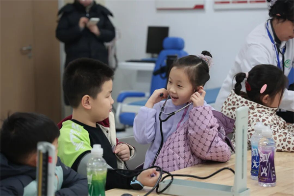 拿起听诊器、血压计,孩子们像模像样地化身“小医生”,与小伙伴相互测量、认真“坐诊”。在实践中学习健康知识,体验医学科技的神奇。