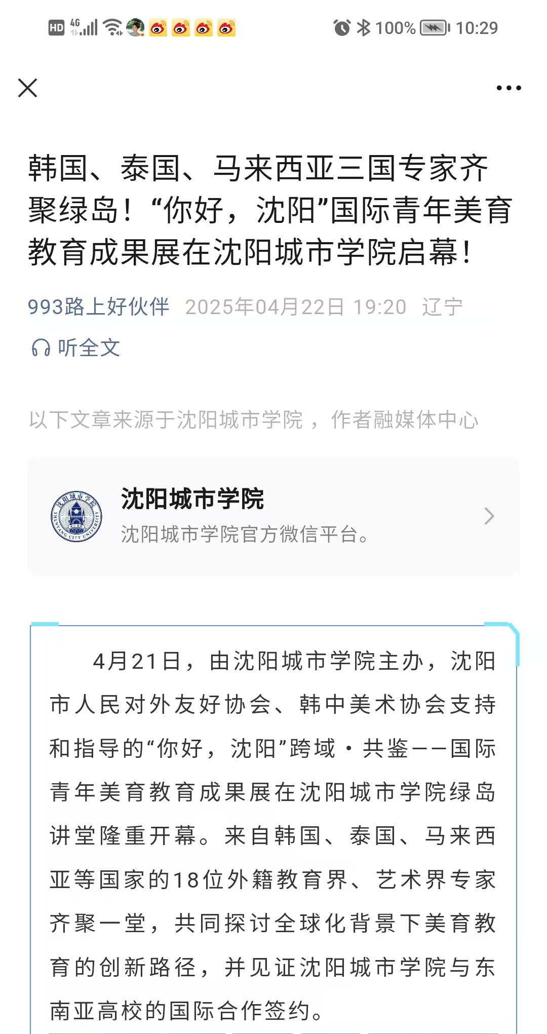4月21日,由沈阳城市学院主办,沈阳市人民对外友好协会、韩中美术协会支持和指导的“你好,沈阳”跨域·共鉴——国际青年美育教育成果展在沈阳城市学院绿岛讲堂隆重开幕。来自韩国、泰国、马来西亚等国家的18位外籍教育界、艺术界专家齐聚一堂,共同探讨全球化背景下美育教育的创新路径,并见证沈阳城市学院与东南亚高校的国际合作签约。