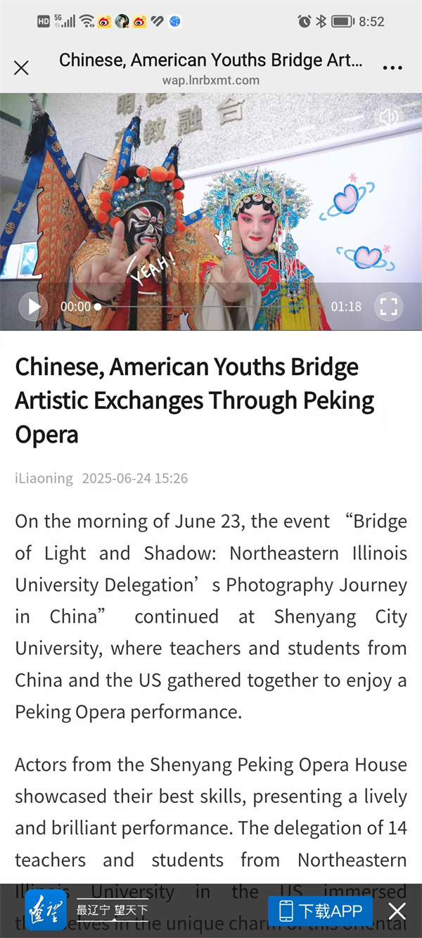 6月24日,“光影之桥——美国东北伊利诺伊大学艺术学院师生中国行”结束了在辽宁省沈阳市的活动。在历时7天的时间里,沈阳城市学院与美国东北伊利诺伊大学的学生联合采风,进行文体交流。中美大学生通过“青春对话”,结下了深厚友谊。