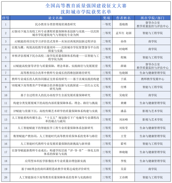 近日,全国高校质量保障机构联盟(CIQA)发布“2025CIQA年会暨高等教育质量强国建设征文评选结果的公示,我校教师在本次赛事中共斩获20项大奖,其中一等奖1项、二等奖5项、三等奖14项,获奖总数位居全国153所参赛院校首位!这是学校在高等教育质量保障领域研究实力与实践成效的集中体现,也是我校持续推进质量文化建设、深化教育教学改革的又一重要成果。
