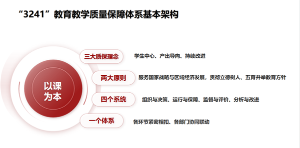 近年来,学校紧紧围绕落实立德树人根本任务,构建了一个遵循学生中心、产出导向、持续改进三大理念,坚持服务国家战略与区域经济发展,贯彻立德树人、五育并举教育方针两大原则,依托组织与决策、运行与保障、监督与评价、分析与改进四个系统,形成各环节紧密相扣、各部门协同联动的教育教学质量保障闭环运行体系(简称“3241”),并将质量意识融入教育教学全过程,形成了人人关注质量、人人追求质量的浓厚文化氛围。